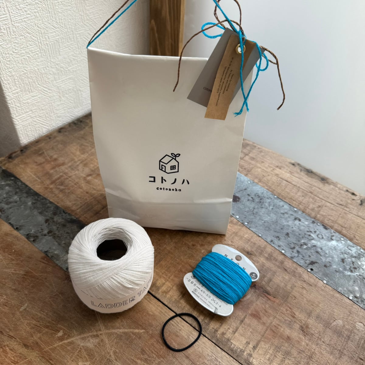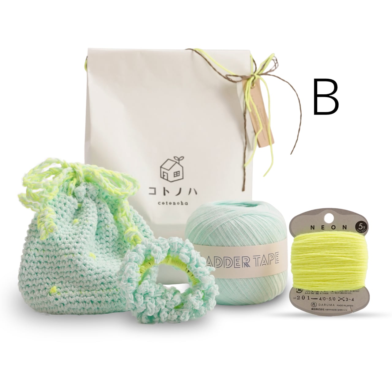 ラダーテープ1玉とNEON1つで、フリルシュシュと巾着どちらも作ることができるコトノハオリジナルのKITです。