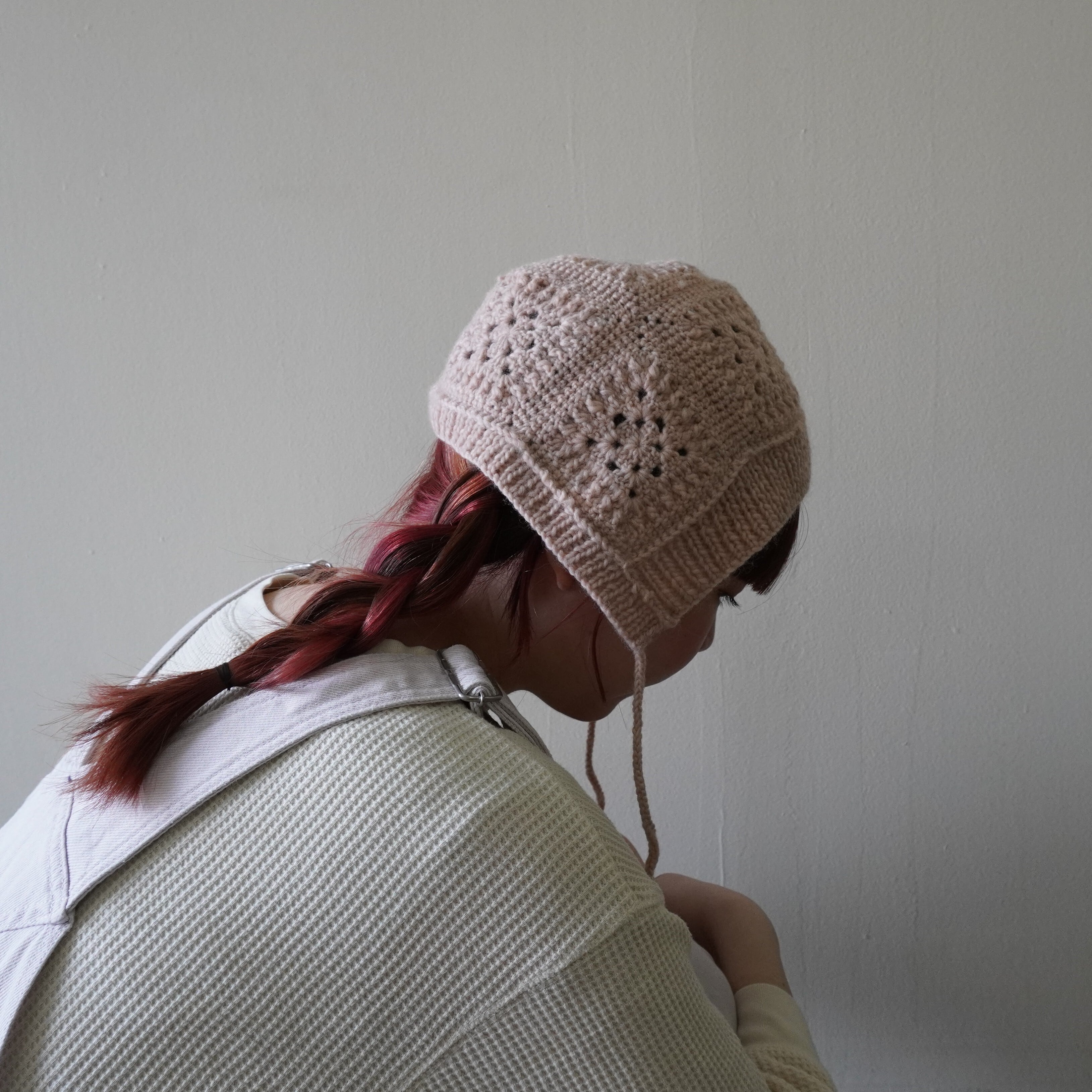 原毛の風合いに近い糸で編むフーディーキャップ。