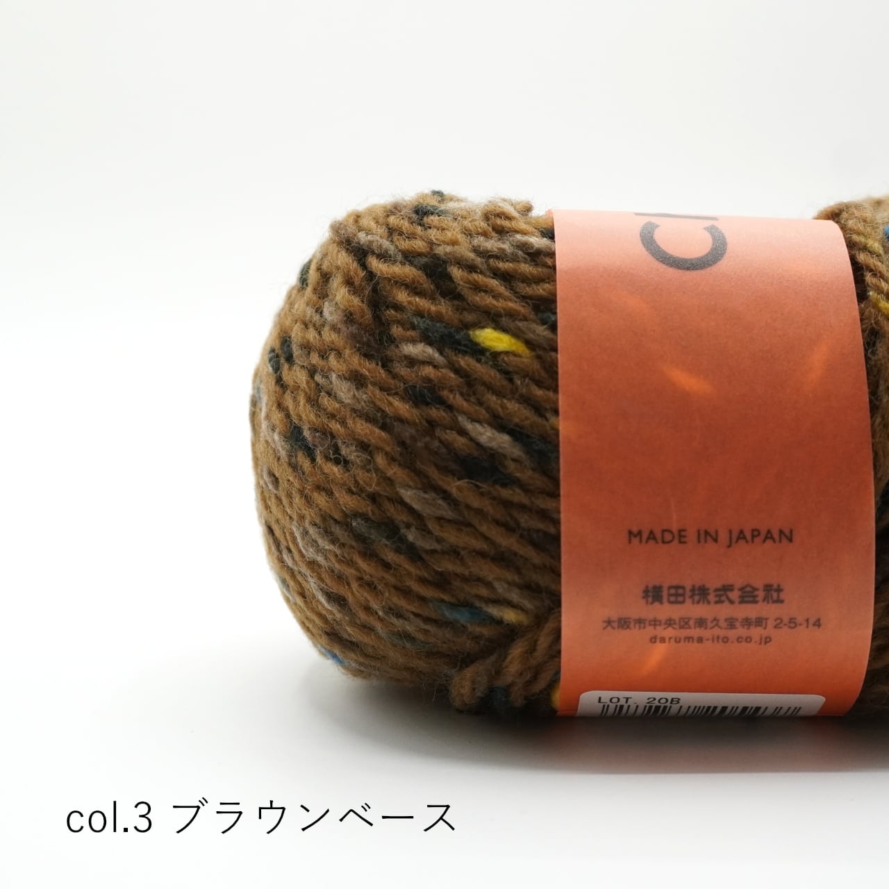 カラフルなチップを混ぜ込んだようにスパイラル状に撚り合わせた毛糸です。色鮮やかなカラーリングと落ち着いた色の組み合わせがあるので、編むものによって雰囲気が変わるのが魅力的です。