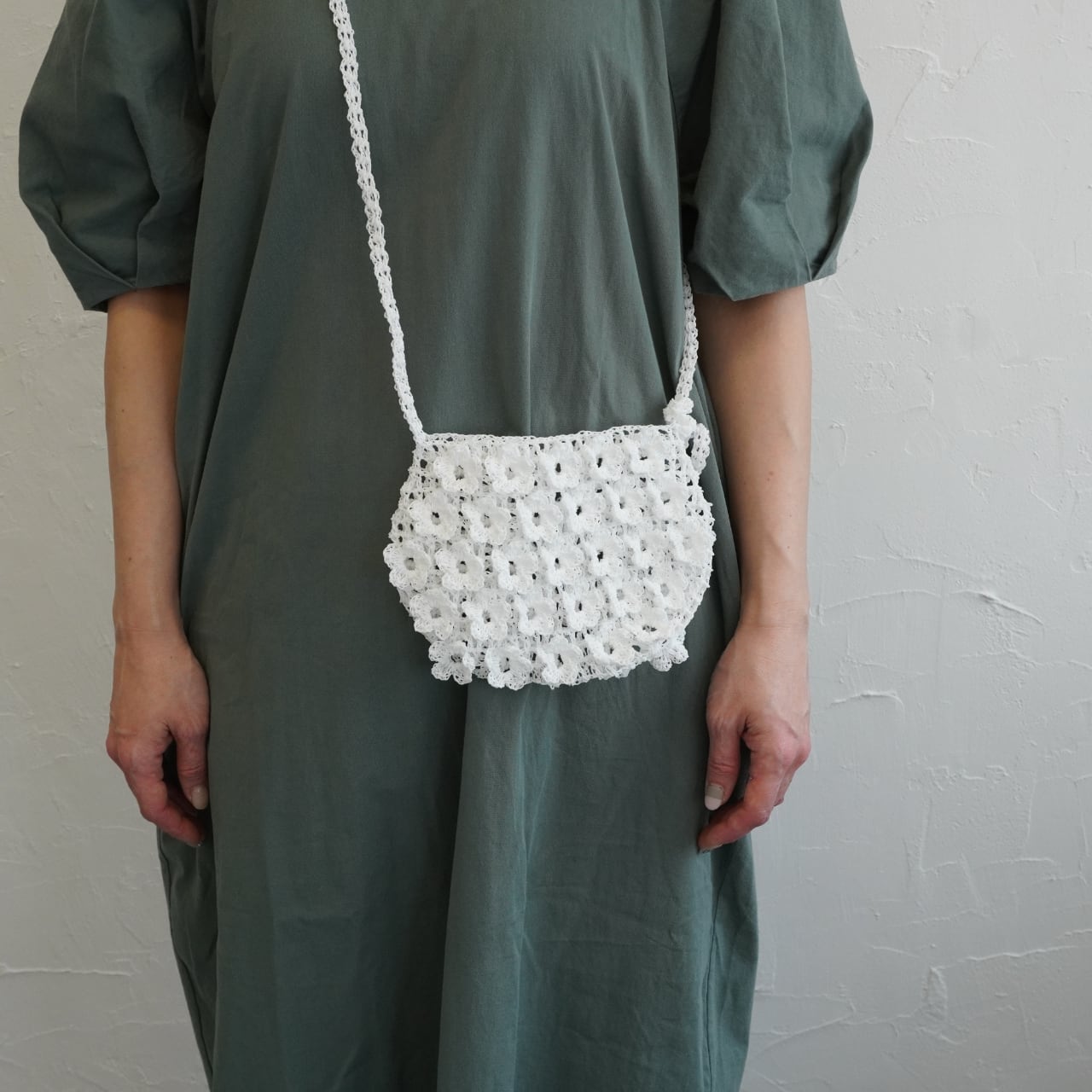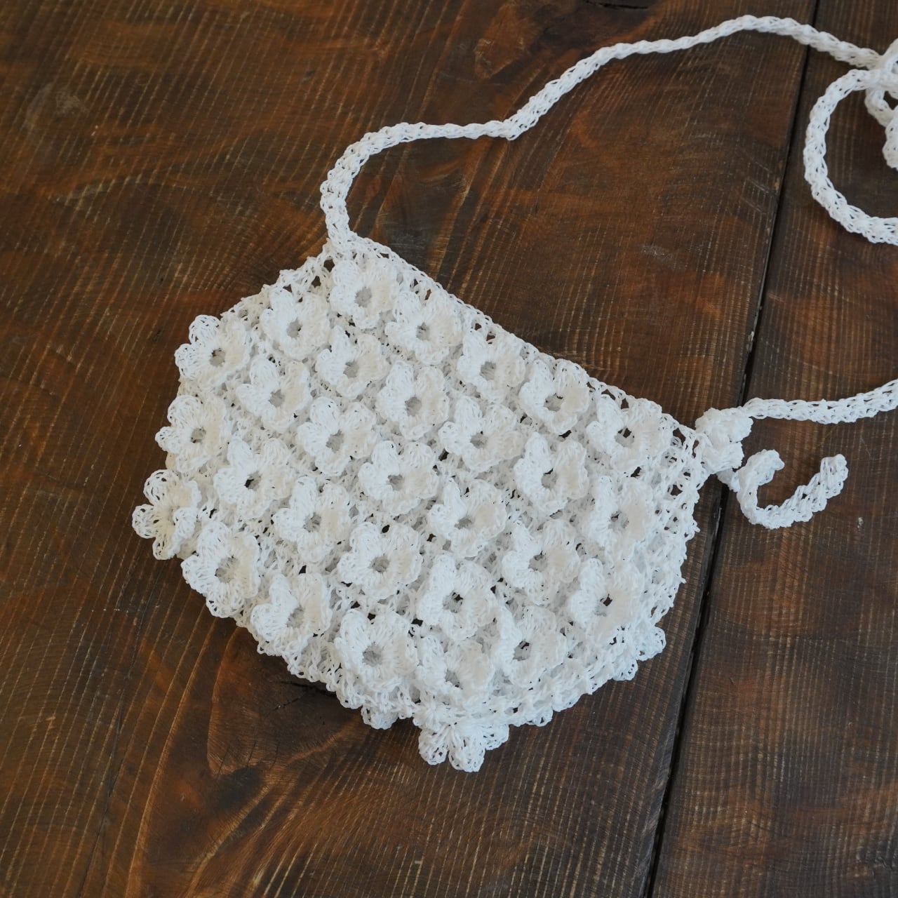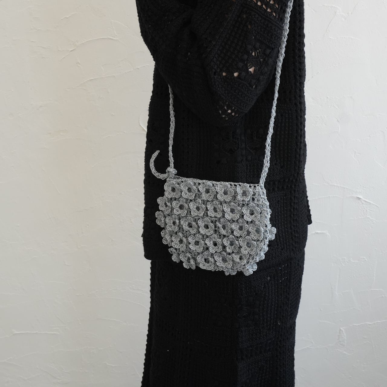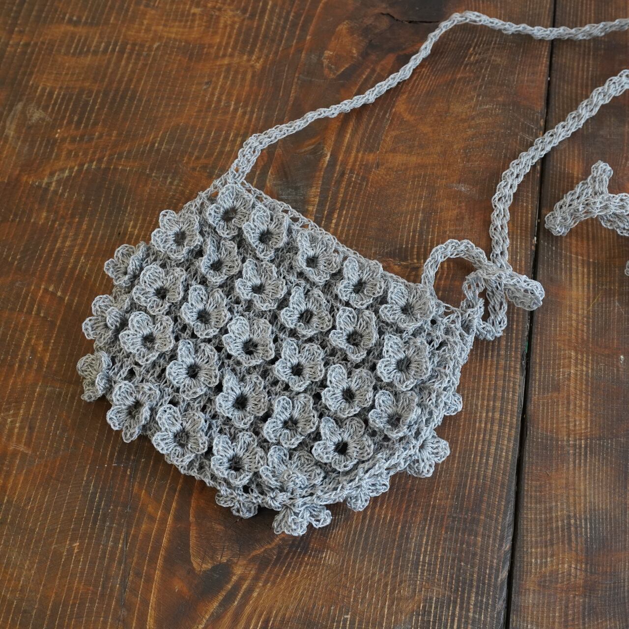 立体的なお花の形のモチーフを編み付けたポシェット。