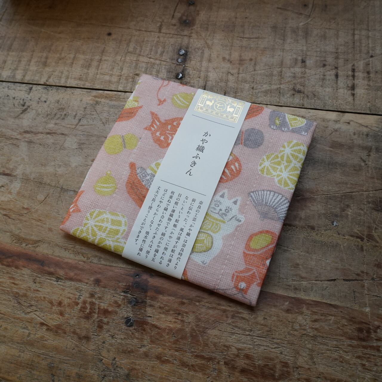 招き猫やだるま、打ち出の小槌など日本の縁起物をモチーフにしたかや織ふきん。