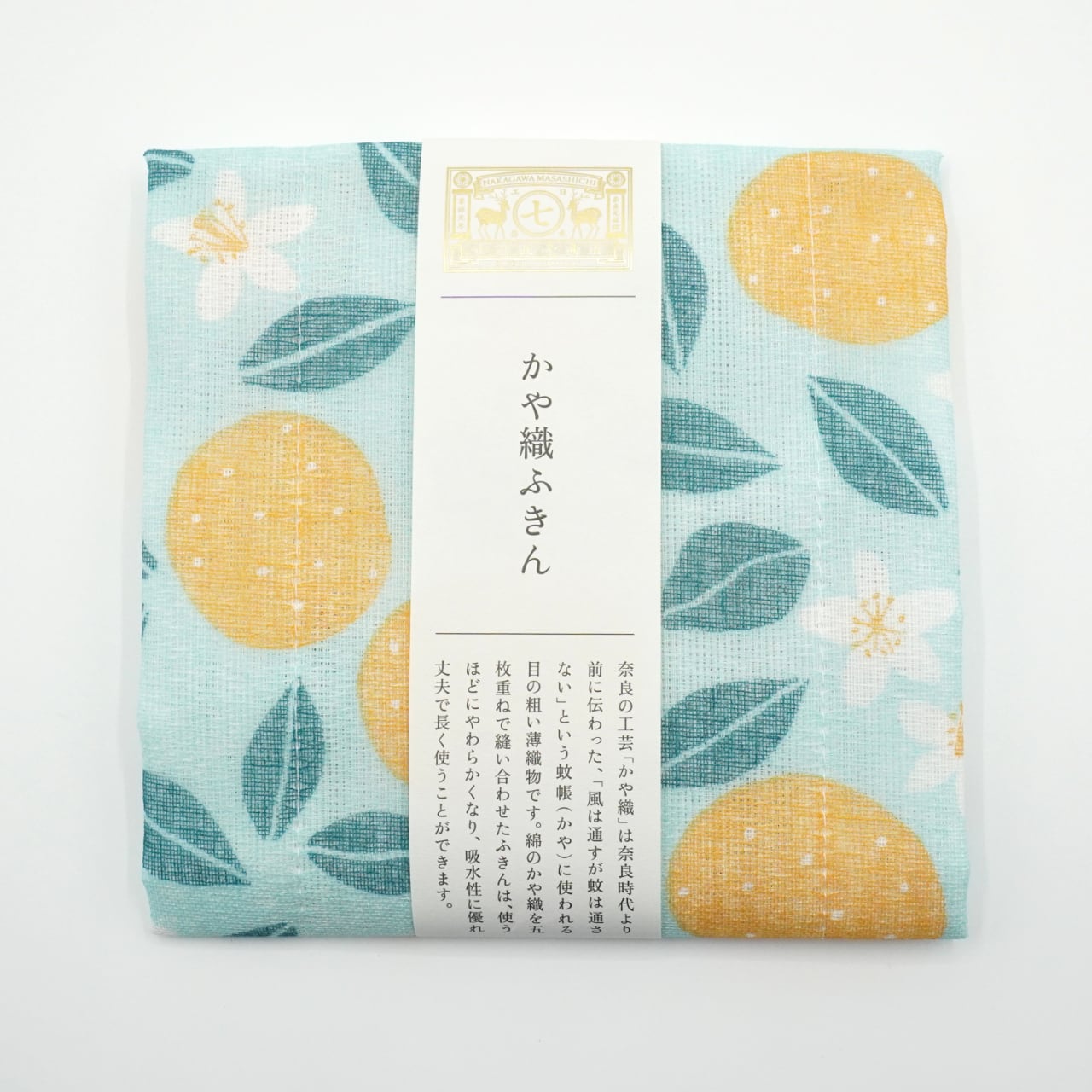 爽やかな夏の味覚、夏蜜柑とその可憐な白い花が全体に散りばめられたかや織ふきん。